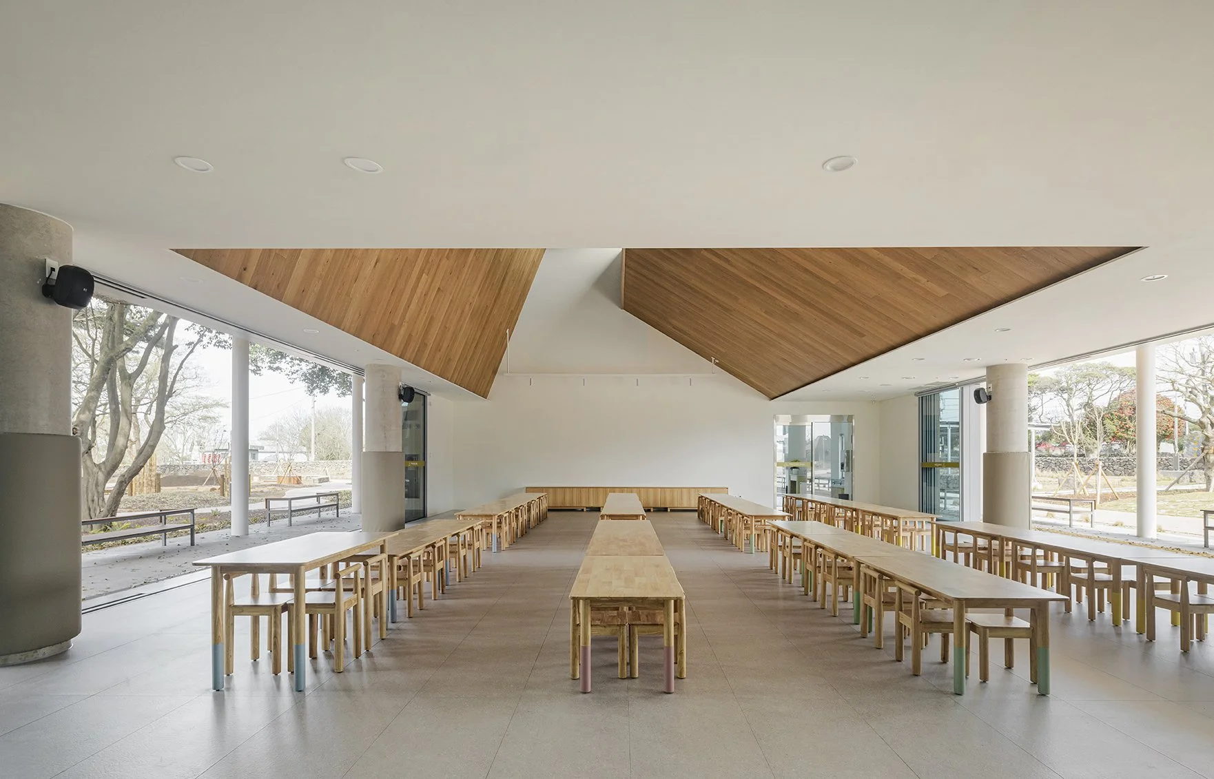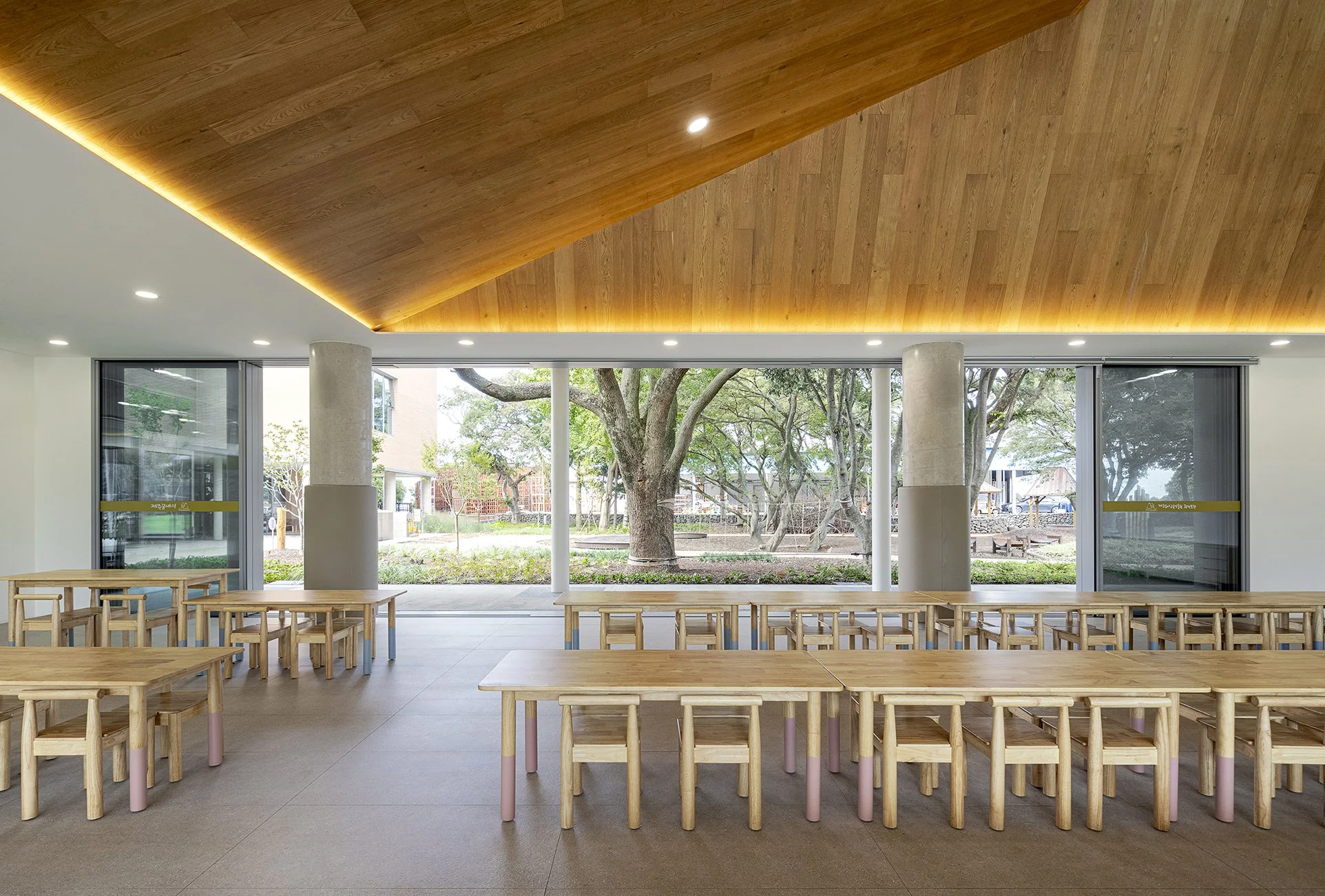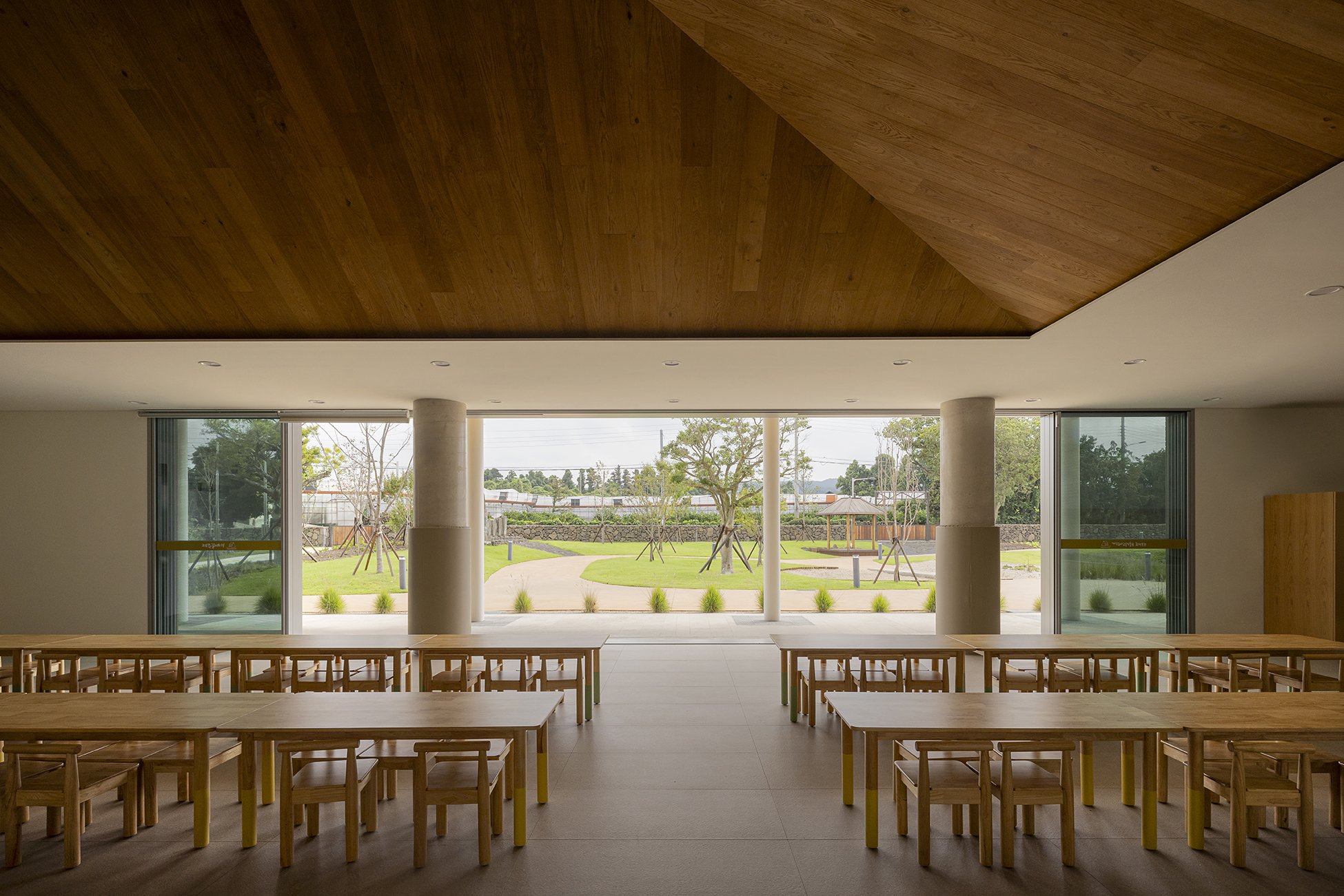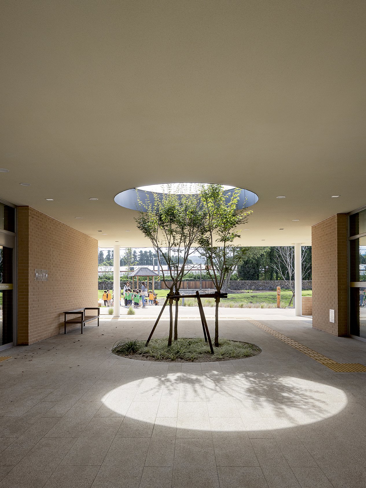 외부 공간은 제주의 자연을 담아내기 위해 건물을 드러내기 보다 건축적 매스를 단순화하여 주변 경관과 자연스럽게 어우러질 수 있도록 하였다. 제주의 오름에서 보여지는 부드러운 선은 대지 위에서 건물과 연계된 언덕과 빗물정원으로 형상화된다. 조경 계획은 회천분교의 먼나무, 베롱나무 등 기존 식생을 이식하여 장소의 역사를 잇고, 제주의 낙엽수와 다년생 초화류를 새롭게 식재했다. 이를 통해 내부 공간까지 깊숙이 스며든 자연의 흐름은 계절의 변화를 고스란히 담아내며 하나의 연속된 풍경을 완성한다.