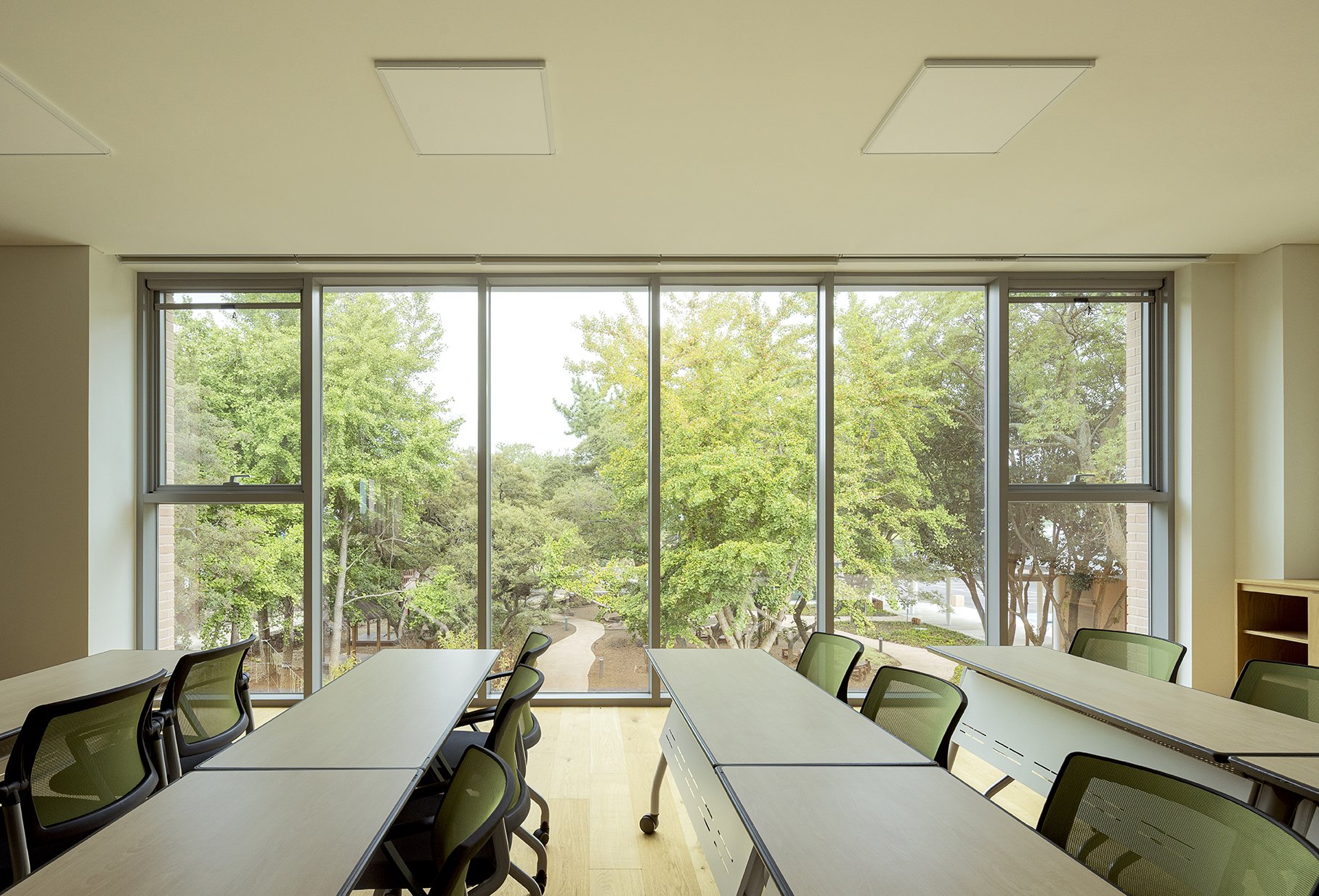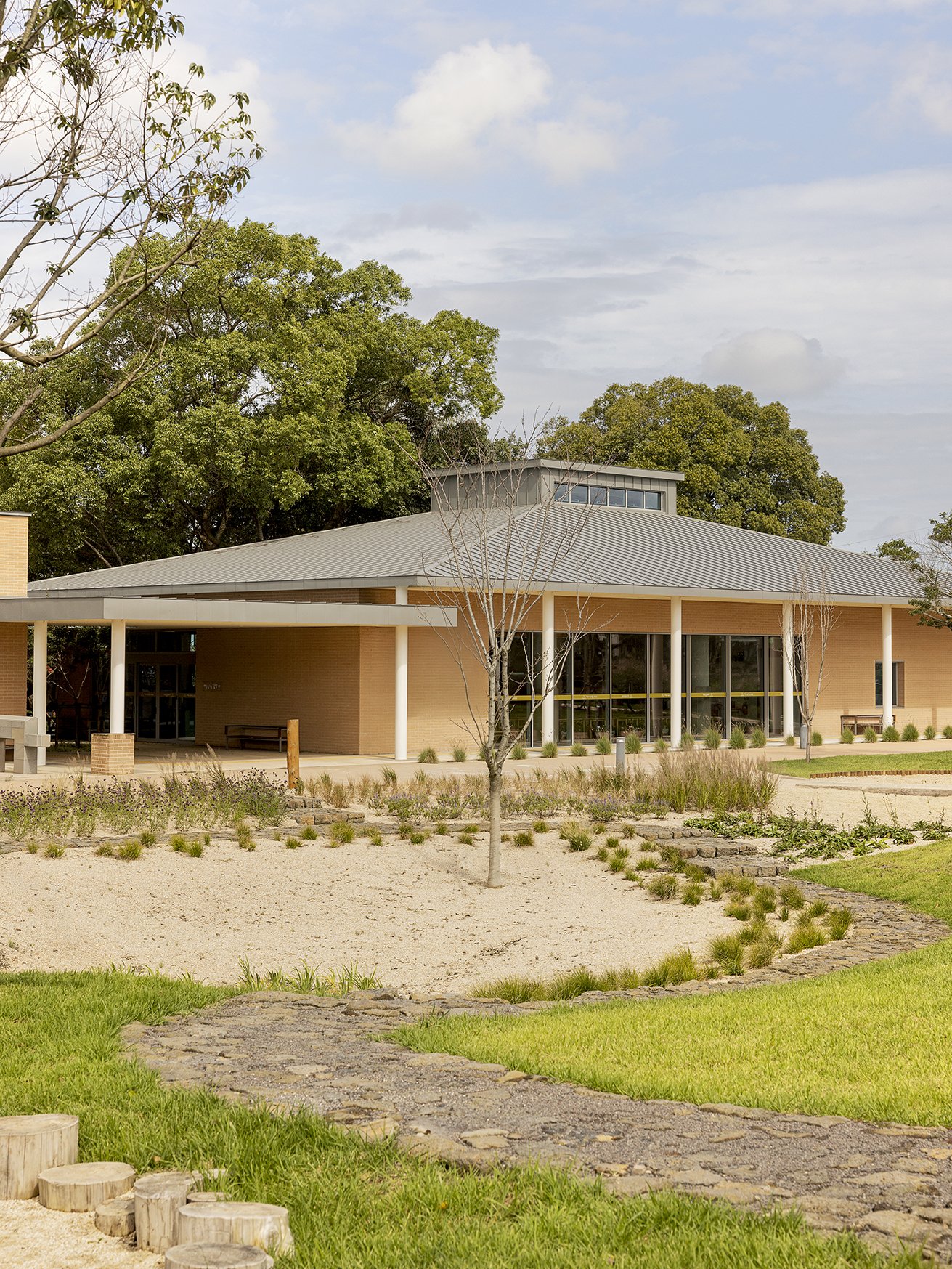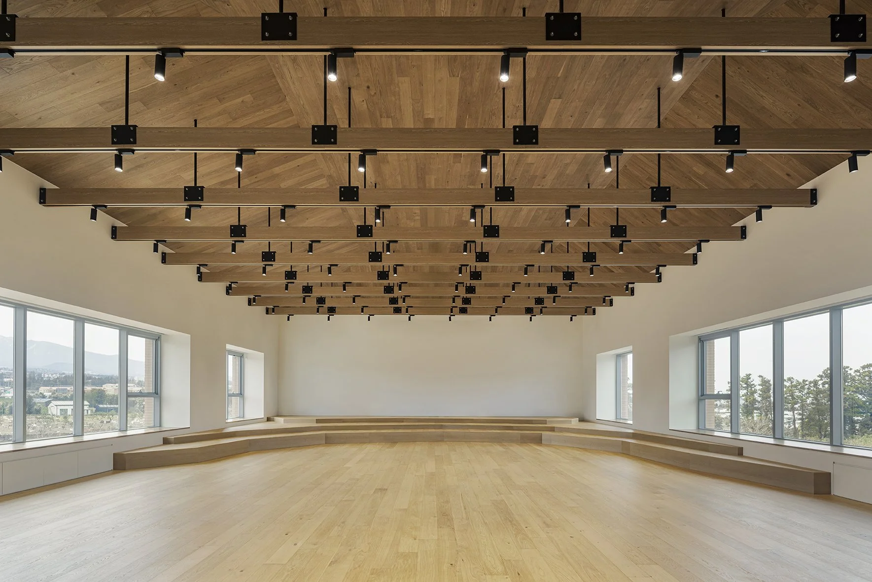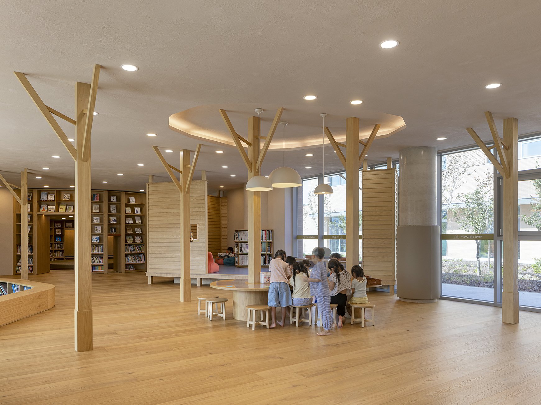 외부 공간은 제주의 자연을 담아내기 위해 건물을 드러내기 보다 건축적 매스를 단순화하여 주변 경관과 자연스럽게 어우러질 수 있도록 하였다. 제주의 오름에서 보여지는 부드러운 선은 대지 위에서 건물과 연계된 언덕과 빗물정원으로 형상화된다. 조경 계획은 회천분교의 먼나무, 베롱나무 등 기존 식생을 이식하여 장소의 역사를 잇고, 제주의 낙엽수와 다년생 초화류를 새롭게 식재했다. 이를 통해 내부 공간까지 깊숙이 스며든 자연의 흐름은 계절의 변화를 고스란히 담아내며 하나의 연속된 풍경을 완성한다.